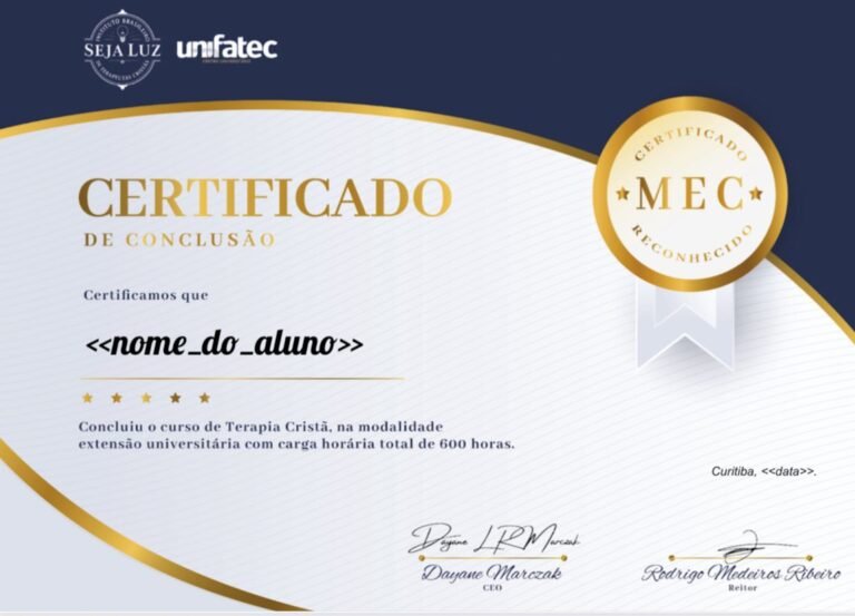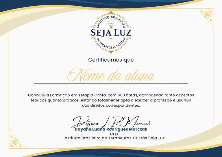Ao concluir o curso e atingir pelo menos nota 70 na avaliação, você receberá 2 (dois) certificados como Terapeuta Cristã. É necessário assistir 100% do curso para solicitar os certificados.